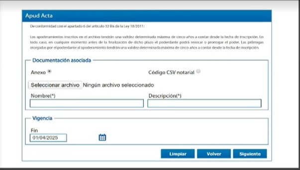6.- Nos solicitará la acreditación de nuestra representación y debemos incorporar nuestra escritura de nombramiento o título: