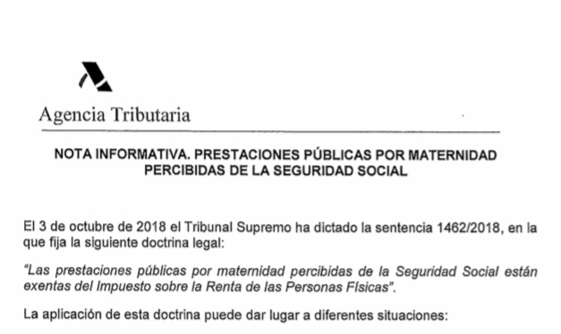 Hoy me ha llegado una nota informativa de la Agencia Tributaria sobre la prestación de maternidad que se puede consultar en el siguiente enlace IRPF MATERNIDAD